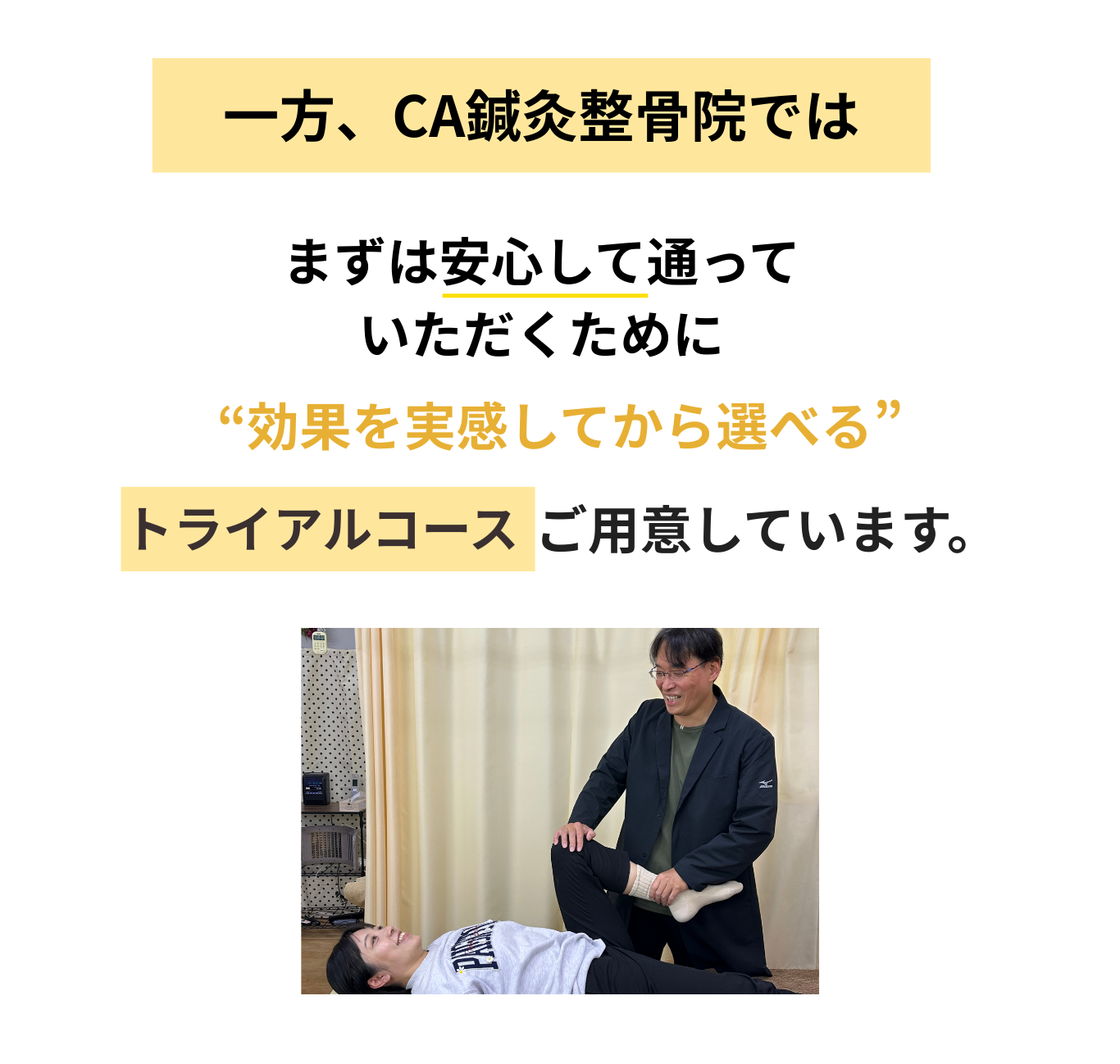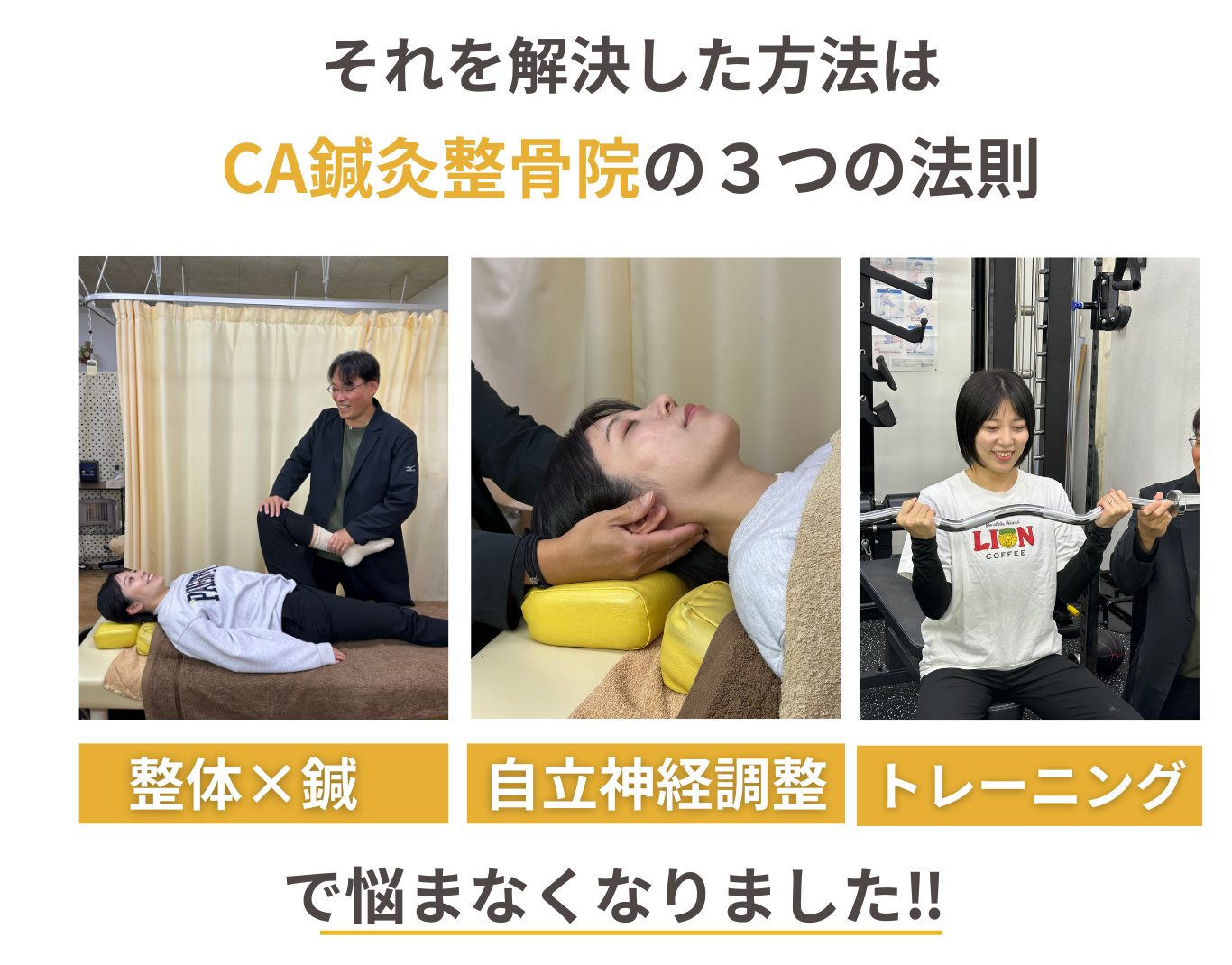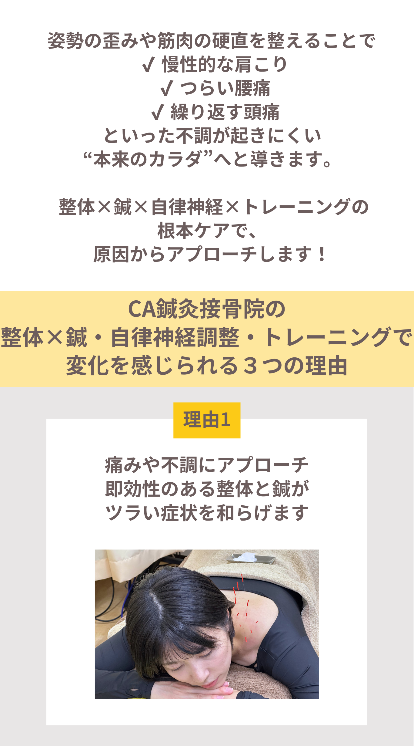 "CA鍼灸整骨院は、葛西駅から徒歩3分にある「身体の根本改善」に特化した鍼灸整骨院です。 当院は、 自律神経・内臓機能・筋肉バランスを“即時”で整える独自メソッド を用い、短時間でも体が軽くなる変化を提供しています。 そんなCA鍼灸整骨院が選ばれる理由は以下の5つです! ①【短時間で体が軽くなる独自の“ゴールドセラピー調整”】 筋肉が緩み、可動域が向上し、自律神経まで整う独自の金属調整「ゴールドセラピー」。 「たった数分で肩が軽くなった!」「動きやすい!」というお声を多くいただいています。 ②【肩こり・腰痛はもちろん、内臓疲労までアプローチ】 辛さの根本には“内臓ストレス”が隠れています。 当院では内臓の疲れやストレスサインを読み取り、短時間で機能を整える施術を行います。 「寝つきが良くなった」「身体が温かい」という変化を感じていただけます。 ③【完全プライベート空間でリラックス施術】 周囲の目を気にせず、落ち着いた空間で施術を受けていただけます。 短時間でも「気分が上がる」時間を提供します。 ④【着替えスペース完備・手ぶらで来院OK】 お仕事帰りや買い物の合間にも立ち寄りやすいよう、着替えスペースを完備。 清潔感のある空間で快適に施術を受けていただけます。 ⑤【スポーツ・日常動作のパフォーマンス向上にも特化】 プロも受ける“フィジカルスタンス分析”により、 姿勢・重心・筋バランスを評価し、動きやすい身体へ導きます。 「動体視力が上がった」「疲れにくくなった」と喜びの声も多数。 CA鍼灸整骨院は、肩こり・腰痛・自律神経の乱れ・疲労改善・パフォーマンスUPまで幅広く対応。 身体の変化を“その場で実感したい”方のご来院を心よりお待ちしております。"